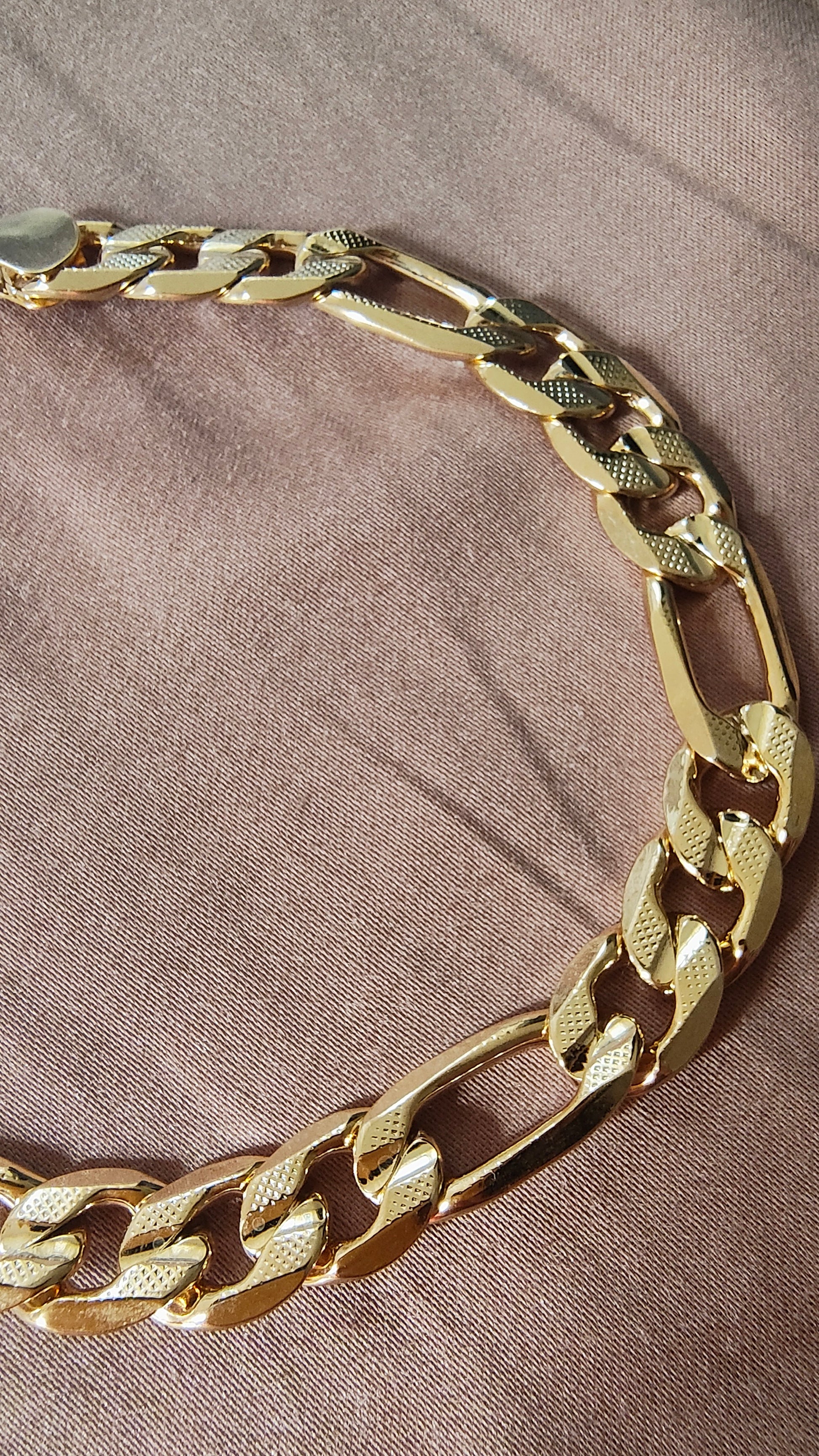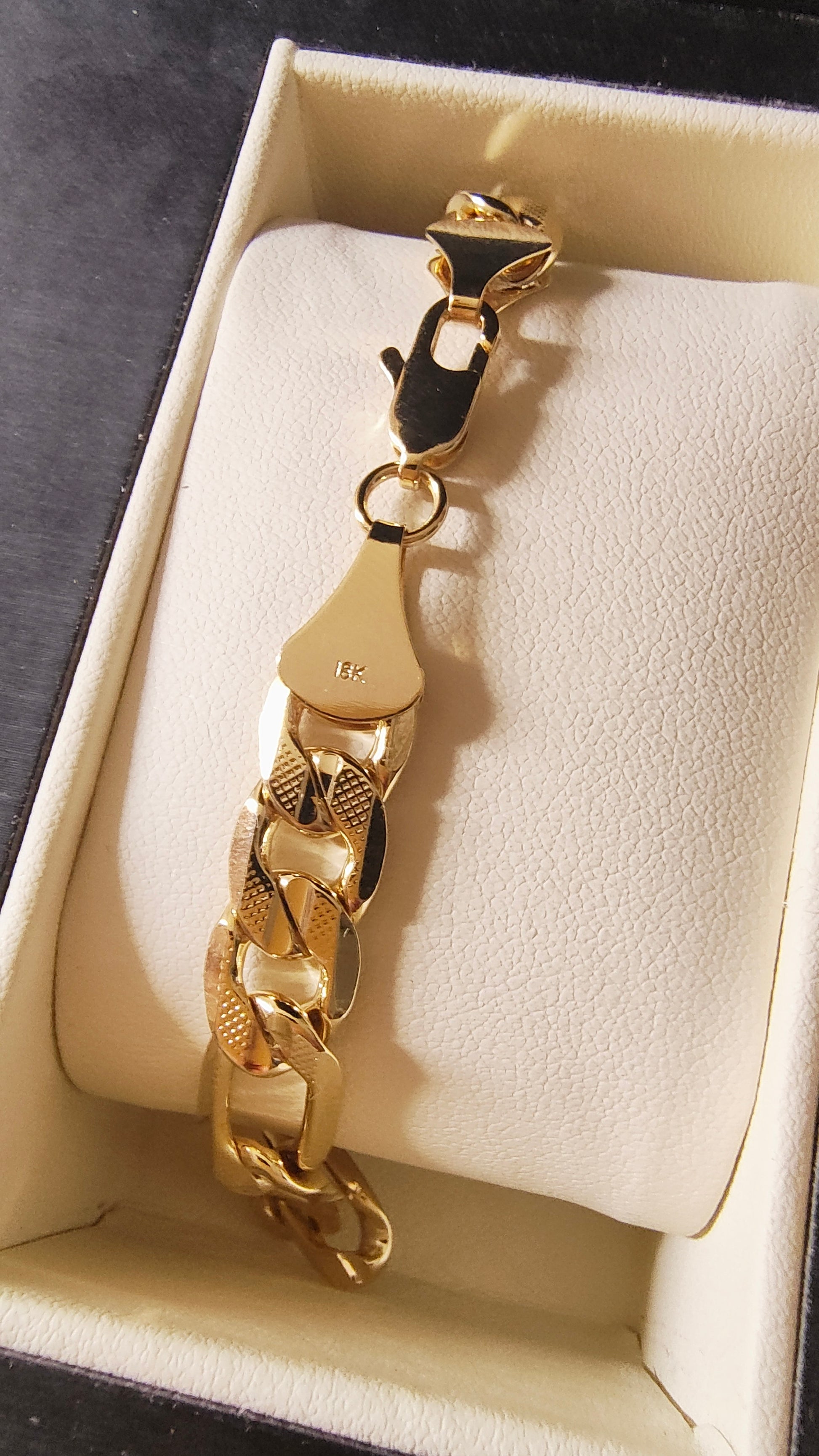 This bracelet is brilliant and heavy, with no visible defects. The purity, 18K, is engraved on the clasp. A studded pattern adds texture to the centerline of each link. There are fine scratches from careful wear on the clasp, only noticed on close inspection. It was crafted and polished by a generational jeweler in Florida. This chain is unmistakably authentic, but if you take it to a boutique and it is in fact fake, you will get a refund and a $100 gift card to my store. If you have further questions or concerns, text me at 305 62two 1224.